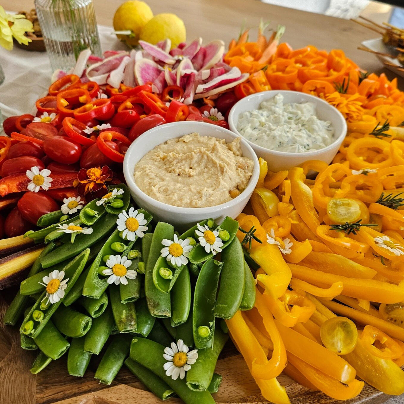 A clean, minimalist board with seasonal veggies, fruit, cheeses, and accompaniments.