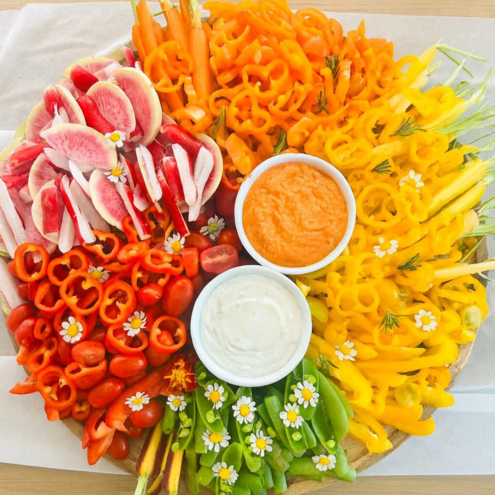 A clean, minimalist board with seasonal veggies, fruit, cheeses, and accompaniments.